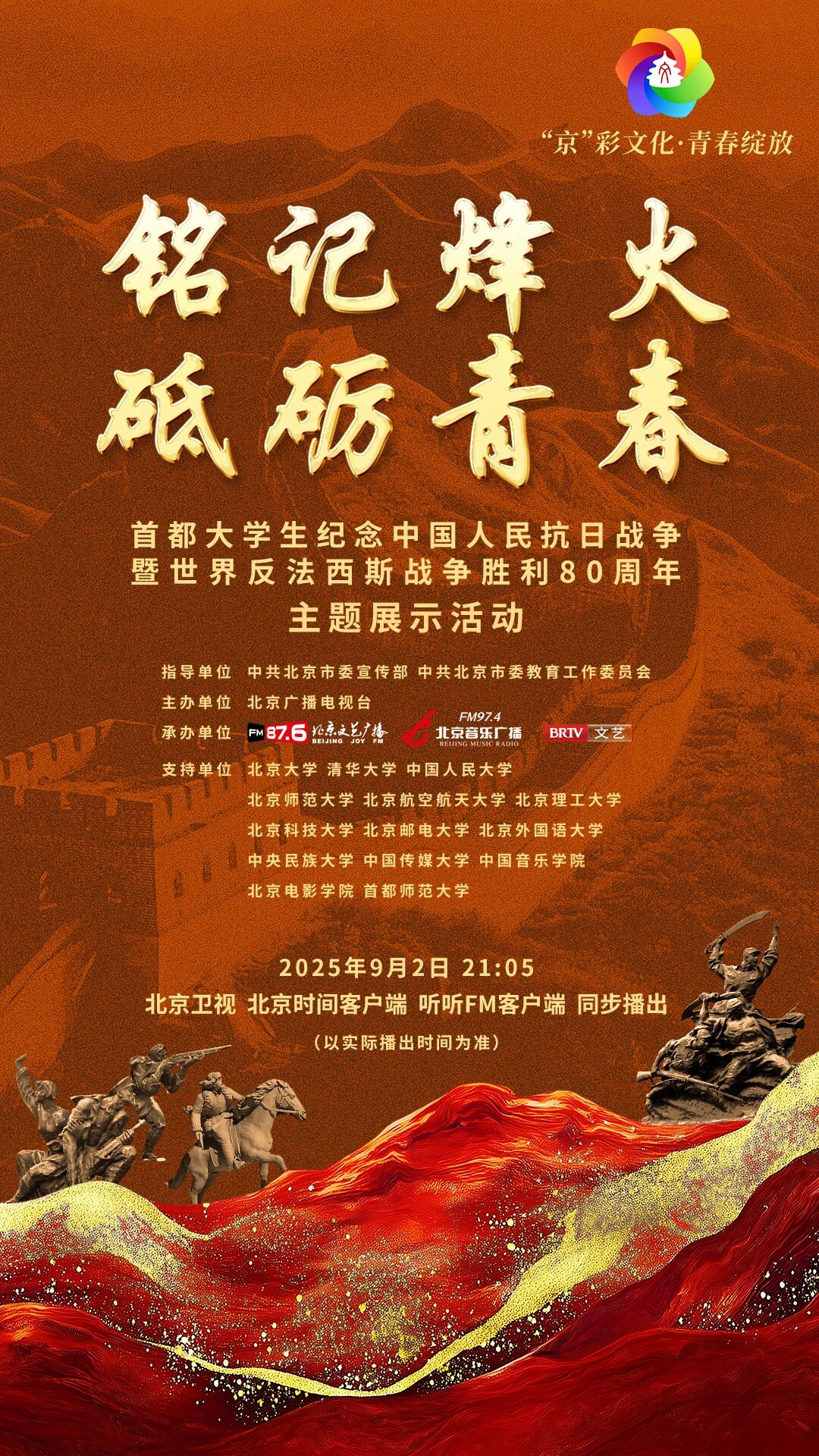 此次活动由北京市委宣传部、北京市委教育工委指导,北京广播电视台倾力打造,联合北京大学、清华大学、中国人民大学、北京师范大学、北京航空航天大学、北京理工大学、北京科技大学、北京邮电大学、北京外国语大学、中央民族大学、中国传媒大学、中国音乐学院、北京电影学院、首都师范大学等14所首都高校师生,以青春视角致敬抗战历史,展现新时代青年的使命担当。