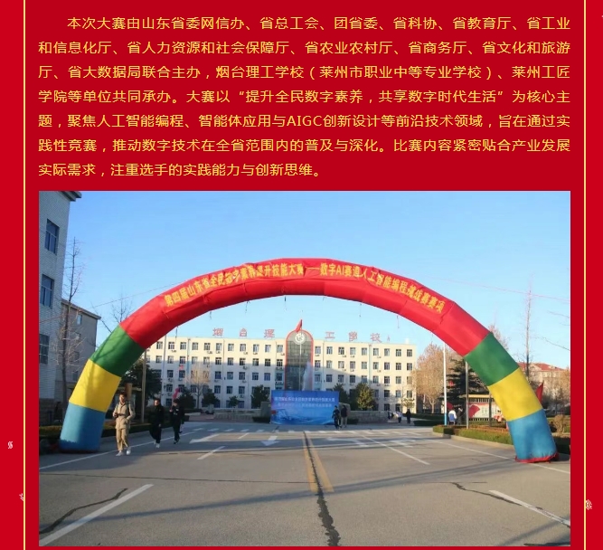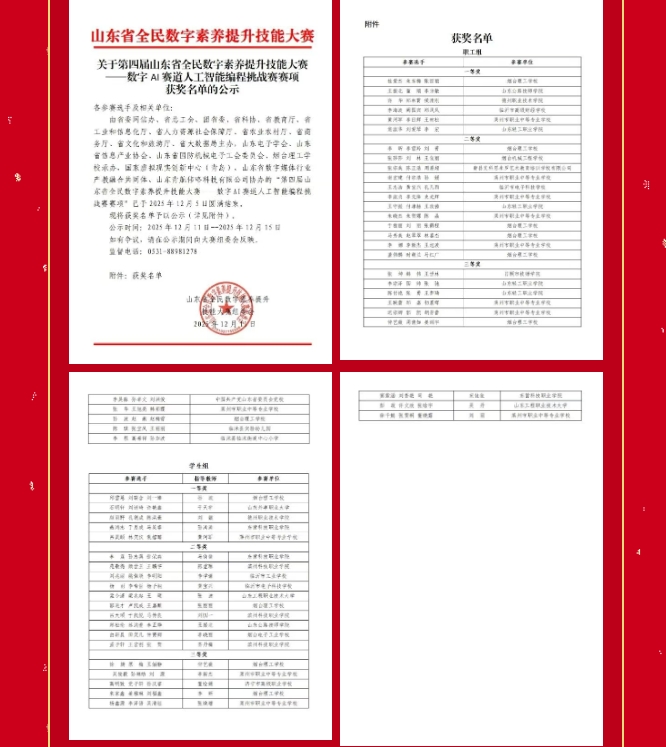 2025年12月11日,第四届山东省全民数字素养提升技能大赛—数字AI赛道人工智能编程挑战赛赛项获奖名单正式揭晓。来自13个县市区的20所学校代表队参赛,经过激烈角逐产生职工组一等奖6组,二等奖12组,三等奖11组;学生组一等奖5组,二等奖10组,三等奖8组。其中烟台理工学校(莱州市职业中等专业学校)2个参赛队获职工组一等奖,8个参赛队获职工组二等奖;2个参赛队获学生组一等奖,1个参赛队获学生组二等奖。